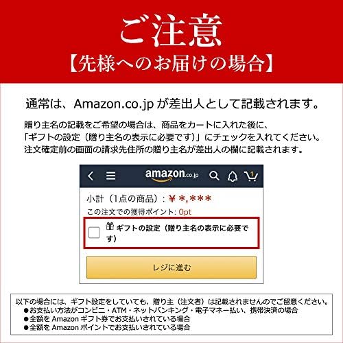 【先様へのお届けの場合】贈り主名の記載をご希望の場合は、<ギフトの設定>を選択し、注文確定前の画面で、請求先住所の贈り主名をご変更ください。 <ギフトの設定>がない場合、Amazon.co.jpが贈り主として記載されます。