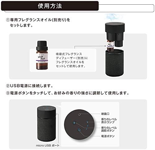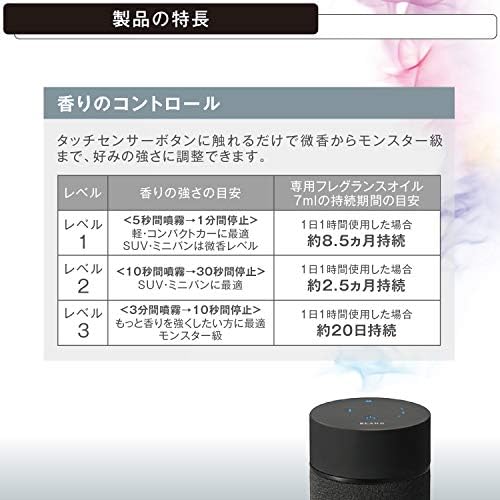 本製品は車載用の噴霧式フレグランスディフューザーです。フレグランスオイルを高圧で噴霧し、瞬時に香りが広がります。