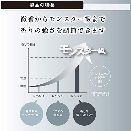 本製品はセンサーボタンを操作するだけで微香からモンスター級まで好みの強さに調節できます。芳香剤を何個も使わないと香りが楽しめなかった大型車も1台で充分に香りをいきわたらせることができます。