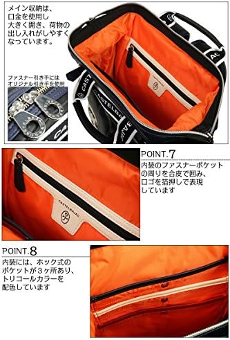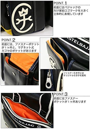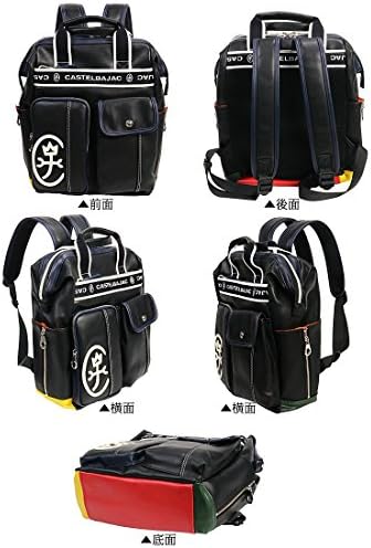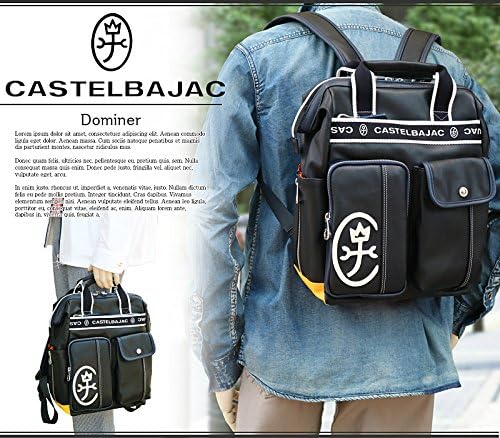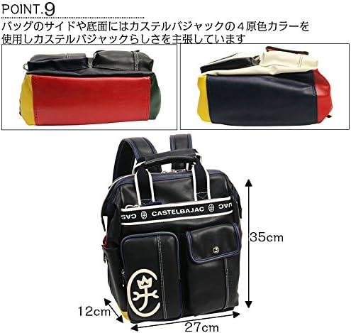 This is a casual A4 backpack with a basic body color and a flashy Castelbajak. The clasp closure opens wide for easy loading and unloading. Both side pockets have zippers for excellent storage.