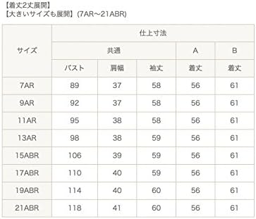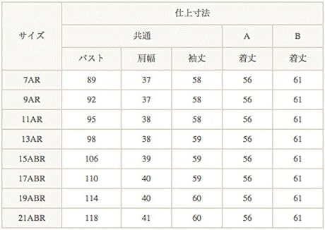 Bust: 7AR: 35.0 inches (89 cm), 9AR: 36.2 inches (92 cm), 11AR: 37.4 inches (95 cm), 13AR: 38.6 inches (98 cm).