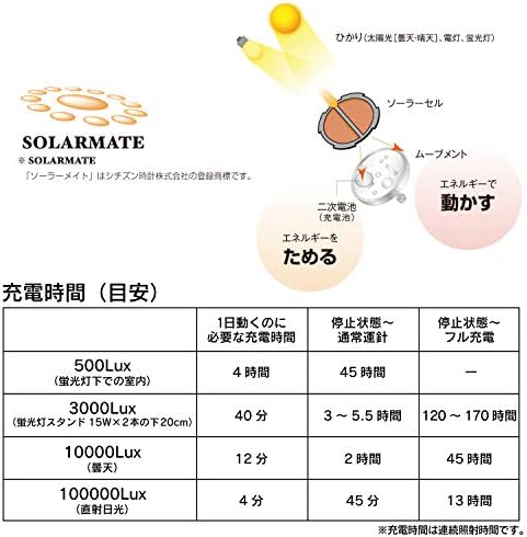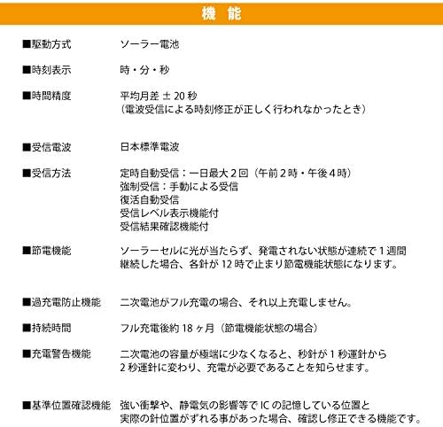 Functions: Radio watch (2 stations in Japan), Solar power (18 months of full charge), Energy saving function, Overcharge prevention function, Charging warning function, Reference position confirmation function.
