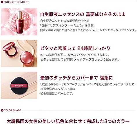 彤人秘(ドンインビ) 自生パーフェクトクッションSPF50 + / PA +++ [美白・シワ改善・UVカット機能性化粧品] エッセンスのしっとりと優れた持続力で24時間健康で美しい肌に演出してくれるプレミアム・エッセンスクッション【成分説明】1. 自生原液エッセンスの中核成分をそのまま自生原液エッセンスの主要成分である「自生クリアスキンフォーミュラ」を含有、健康で輝く肌に整えてくれるプレミアムエッセンスクッションです。2. 快適に密着して24時間ハリのある肌へ均一な微細粒子が肌になじみやすく、快適に密着して、24時間メイクをしっかりと守ってくれます。3. 最初のタッチからカバーまで繊細に5重のルビーセルパフがクッションベースを薄く、軽くしてくれて、水玉形のエッジで小鼻の横まで繊細にカバーします。【TEST REPORT】#24時間#しっとり#長持ち#クッション#自生パーフェクトクッション▶使用直後の保湿指数が161%上昇し、24時間後にも使用前より49%上昇▶使用後24時間後にも変わらないロングラスティング固定力▶使用前より使用後すぐに輝き効果37%上昇*自生パーフェクトクッション使用後の臨床テスト結果:2020.2.26-2020.2.28 / 20歳-55歳の成人女性20名対象/ P&K臨床研究センター(株)▶一日中崩れない肌になったと感じた100%▶肌に軽く密着するのを感じた100%▶肌が華やかになるのを感じた95%▶使用した後、購入意欲ができた95%*自生パーフェクトクッション使用後のアンケート調査の結果:2020.2.26-2020.2.28 / 20歳-55歳の成人女性20名対象/ P&K臨床研究センター㈜肌の色に応じて、作られた3つのカラー13号【華やかなアイボリー]:明るいトーン、豪華な明るさを演出21号[ほのかなバニラ]:中間トーン、生気を演出23号[落ち着いたベージュ]:中間トーン、ナチュラル感