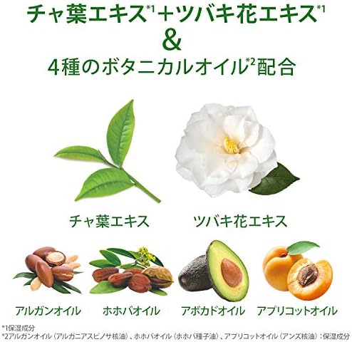 ●チャ葉エキス*1+ツバキ花エキス*1&4種のボタニカルオイル*2配合。 *1保湿成分 2*アルガンオイル(アルガニアスピノサ核油)、ホホバオイル(ホホバ種子油)、アプリコットオイル(アンズ核油):保湿成分