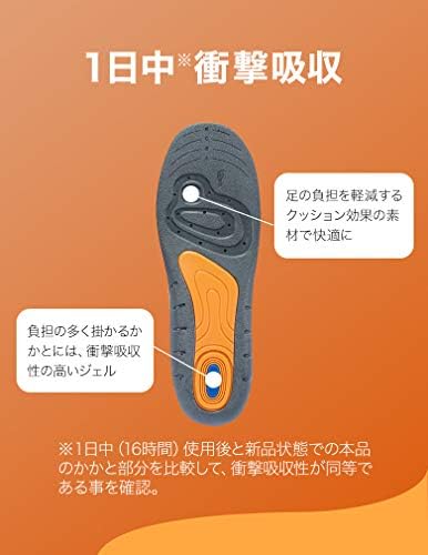 ・1日中* 衝撃吸収 *一日中(16時間)使用後と新品状態での本品のかかと部分を比較して、衝撃吸収性が同等である事を確認。