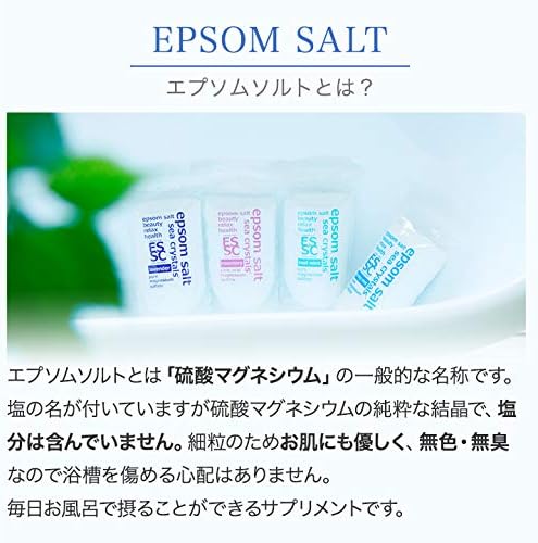 エプソムソルトはミネラル100%です。特にマグネシウムは必須ミネラルです。15000mgのマグネシウム風呂をお楽しみ下さい。肌が綺麗にサラサラになります。