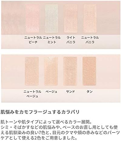 シミ・そばかすなどの肌悩みや、ベースのお直し用としても使える肌馴染みの良い7色と、目元のクマや頬の赤みなどのパーツケアとして使える2色(ニュートラルピーチ・ニュートラルミント)。