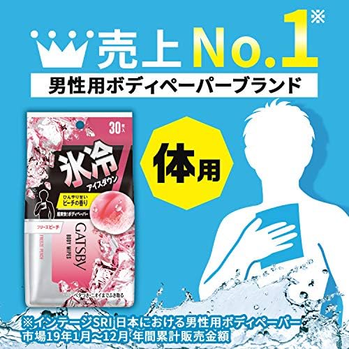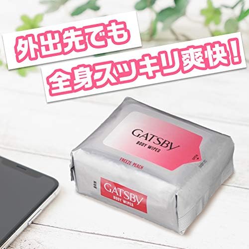 ギャツビー(GATSBY)メンズ用ボディシートシリーズ。男の汗のベタつき・ニオイをスッキリふき取る。クールタイプのデオドラントシート。清涼成分(メントール)配合! 超クールな使用感が長時間持続。1枚で全身しっかりふける厚手の大判ボディーシート採用。夏場の体の汗拭きシートとしてもおすすめ。スッキリとしたさわやかさとみずみずしい甘さのあるひんやりピーチの香り。