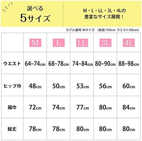 Model wearing M: Height 5 ft 2.8 inches (159 cm), Waist 23.2 inches (59 cm), Size M: Waist 25.2 – 29.1 inches (64 – 74 cm), Hip Width 19.7 inches (48 cm), Hem Width 29.1 inches (72 cm), Total Length 30.7 inches (78 cm), Size LL: 30.1 inches (74 inches (8 inches (74 cm). 0cm [3L size] Waist: 31.5 – 35.4 inches (80 – 90 cm), Hip width: 22.0 inches (56 cm), Hem width: 31.5 inches (80 cm), Total length: 31.5 inches (80 cm), [4L size: Waist: 34.6 inches (88 – 98 cm), Hip width: 23.6 inches (60 cm).