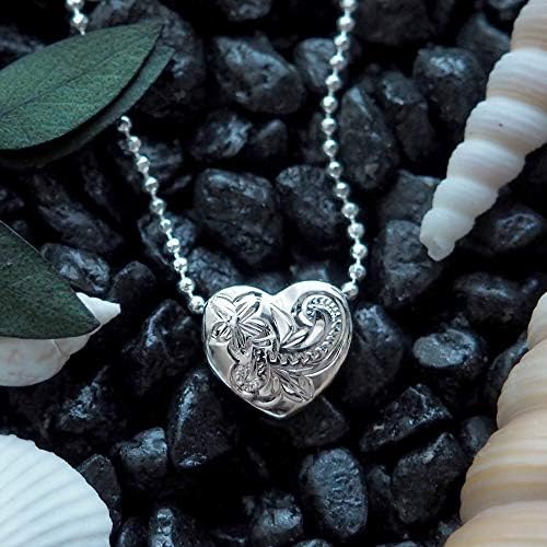 The heart shaped pendant is engraved with Hawaii’s signature flowers, plumeria and wave patterns, and the back has a mile leave.