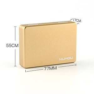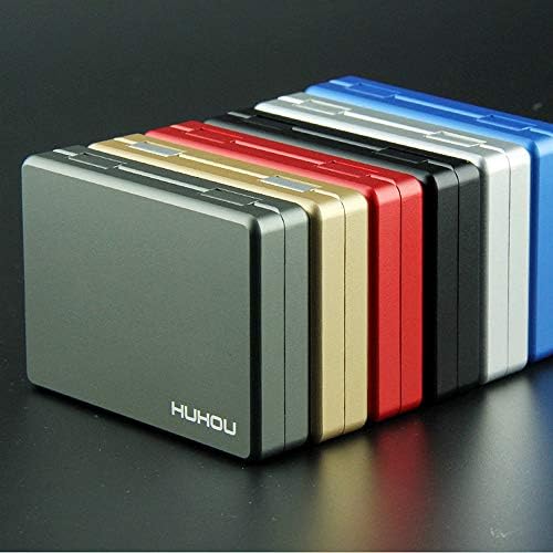 Material: Aluminum alloy; Size: 3.0 x 2.2 x 0.7 inches (77 x 55 x 17 mm); Capacity: 20 pieces; Weight: Approx. 2.1 oz (60 g); Color: Gold, Silver, Black, Red, Blue