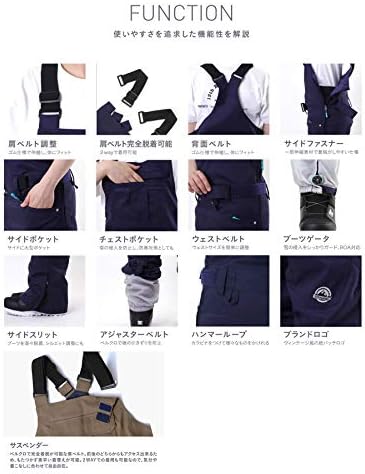 【使いやすさを追求した機能性】肩ベルト調整、肩ベルト完全脱着可能可能、背面ベルト、サイドファスナー、サイドポケット、チェストポケット、ウエストベルト、ブーツゲーター、サイドスリット、アジャスターベルト、ハンマーループ、ブランドロゴ
