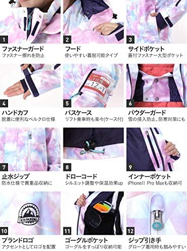 [Functional for ease of use] (Jacket): Zipper guard, hood, side pocket, hand cuff, pass case, inner pocket, waterproof zip, drawcord, zipper pull, brand logo embroidery, goggle pocket (pants)… Suspenders, waist belt, side pockets, shoulder belt can be completely removed, hip seam, boot gaiter, edge guard, adjuster belt, brand logo button.