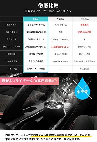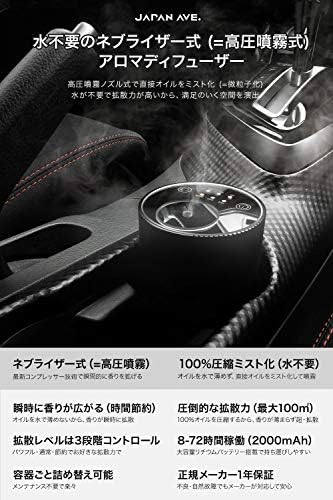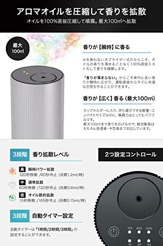 ✅【 香りの強さは3段階レベルでコントロール可能 】3段階の香り拡散レベルから、空間に合わせたお好みのレベルで設定ができ香りの強さを自由自在にコントロールできます。 ✅【 ネプライザー式で「香り」の強さが一定に 】一般的な芳香剤は気温・湿度などに影響を受けて、香りの強さに大きく影響がありました。しかし、本製品はネブライザー式の高圧噴霧技術により、1年中香りの強さを一定にすることができます。 ✅【 容器ごと入れ替える可能なため、カビや雑菌の繁殖を防ぐ 】従来の超音波式ディフューザーは水の入れ替えが必要になり、長期間使用することでカビや雑菌の繁殖の場として格好の場になっていました。しかし、本製品はオイルを直接ミスト化するコンプレッサー技術 (=圧縮技術) を搭載しており、水不要で天然のエッセンシャルオイル100%を直接車内に噴霧することで、100%天然の香りで空間を満たすことができます。 .