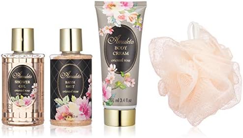 エレガントで落ち着いた雰囲気のあるAMULETOシリーズは、大人っぽい方におすすめのボディケアセット。シャワージェル(150ml)、ボディクリーム(100ml)、バスソルト(150g)、ボディスポンジが入っています。