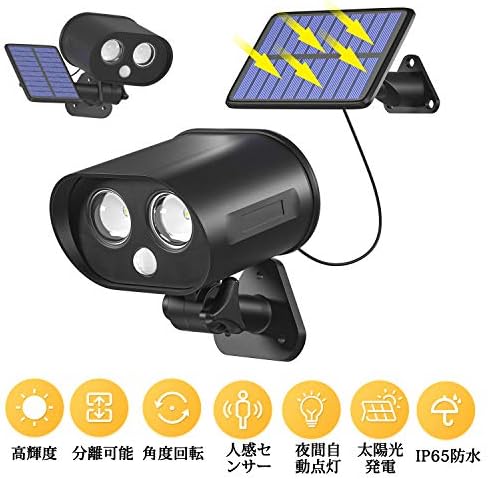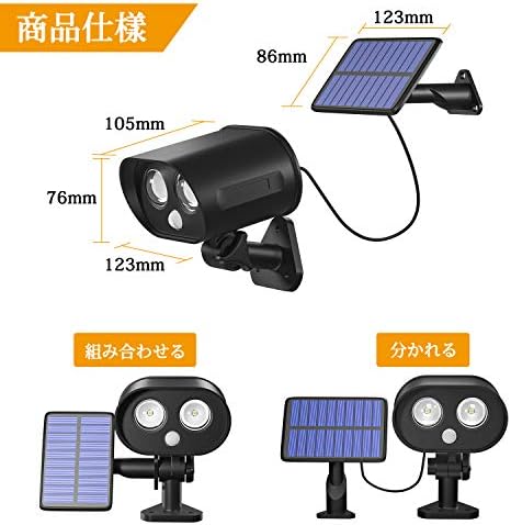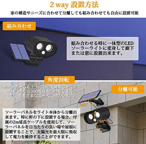 ソーラーパネルとLEDライト本体が分離可能で、2メートルケーブルで繋がって、日陰でご利用の場合は、パネルを日当たりの良い場所に設置し、ライトだけを日陰に設置することで、日照不足を防ぎます。