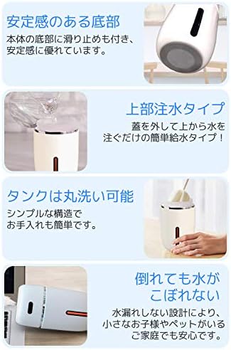 Silent Humidifier: The operating sound is about 30 dB (decibel), very quiet, quieter than the library, so you don’t have to worry about disturbing your sleep. One-touch: With only one button, you can quickly start moisturizing with a single touch. Choose the humidification amount: Press the power button once, and press it again (2nd time), you can choose the humidification volume by pressing the power button (3 seconds to stop for 3 seconds). (Bottom with a Stable Feeling) The bottom of the unit is also anti-slip for excellent stability. (Top Water Fill Type) Easy water supply type by simply removing the lid and pouring water from the top. (Tank is fully washable) The simple construction makes it easy to clean
