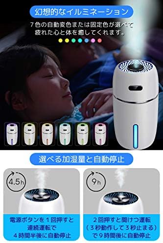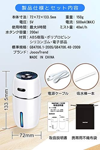 Compact tabletop humidifier: This is a small ultrasonic humidifier that can be easily carried anywhere. USB Powered: It is USB powered, so it can be powered by a computer or mobile battery, making it very convenient to carry around or in your car. Energy Saving: Only 2.5 W power consumption. 7-Color LED Lights: Equipped with colorful LED lights, you can choose between 7 automatic color changes or fixed colors to create a fantastic night light illumination, and gentle light naturally heals your tired body and mind. Silent Humidifier: The operating sound is about 30 dB (decibel), very quiet, quieter than the library, so you don’t have to worry about disturbing your sleep. One-touch: With only one button, you can quickly start moisturizing with a single touch. Choose the humidification amount: Press the power button once, and press it again (2nd time), you can choose the humidification volume by pressing the power button (3 seconds to stop for 3 seconds). (Bottom with a Stable Feeling) The bottom of the unit is also anti-slip for excellent stability. (Top Water Fill Type) Easy water supply type by simply removing the lid and pouring water from the top. (Tank is fully washable) The simple construction makes it easy to clean. Small size but large capacity / long time operation: Even small enough to fill 7.8 fl oz (200 ml) at a time, automatic shut-off after 4.5 hours in continuous operation mode, and stop at 9 hours after the intermittent operation mode (works for 3 seconds for 3 seconds). Safety, Fall Waterproof, No Hot: The mist is ultrasonic so it won’t get hot, even if it falls, it is safe to use in homes with children and pets. Compatible with hypochlorite water: When using hypochlorite water, please dilute it to 0.5% or less (0.04 fl oz (200 ml) of water and less than 0.04 fl oz (1 ml) of water. This is not recommended to use hypochlorite water. The effects and effects of hypochlorite water may be described as this product may occur, so please check it carefully before using. Aroma Compatible: You can use water-soluble aroma oil or aromatic water. Cannot be used with oil-based aroma oils. Use a water-soluble aroma Car Humidifier: Perfect for car drink holders, and is an essential item for cars where it tends to dry out. Reduces bacterial growth and fills with fresh air. Smartphone powered USB port: USB powered for convenient use in the car, and it also has a USB port that allows you to power your smartphone from the humidifier. [Compatible with Air Conditioner] When used with an air conditioner, the mist diffuses and humidifies the air inside and inside the car quickly, preventing static electricity, preventing dust from splashing out, and helps prevent the nose and throat. (Prevents dryness and rashes) As a countermeasure for dryness and dryness of your skin, it creates a relaxing atmosphere at the same time. Ultrasonic Humidifier: Uses ultrasonic waves to fine particulate water. Ultrasonic misting naturally wicks away comfortable moisture and creates a clean environment. Ultrasonic components vibrate at high frequency to separate water molecules and produce a clean mist and mist. Great as a Gift: Perfect as a gift for your loved ones on their birthdays or cold seasons, and everyone will appreciate it. Size: 2.8 x 2.8 x 5.1 inches (7.2 x 7.2 x 13 cm) (Diameter 2.8 x Height 5.2 inches (7.2 x 13.3 cm); Set Contents: Main unit, power cable, instruction manual, 1 water absorbing rod, portable non-woven bag. Country of Origin: China. Brand: JoooyTrend