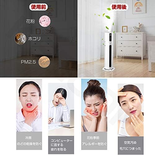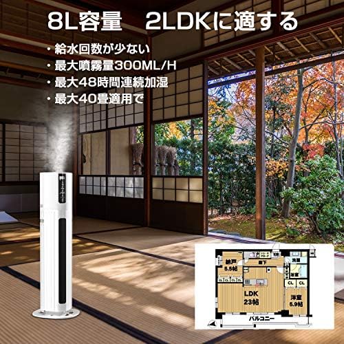 【8L超大容量 2LDKに適する】①加湿器は大容量のため給水回数も少なく、手間が省ける ②48時間以上運転し続けられ ③対応面積も広く、最大40畳適用で、大家族のリビングやお部屋はもちろん、ひとり暮らしのアパート・ワンルームあるいは仕事場でも大活躍 ④8Lの加湿器の最大噴霧量は300mL/h