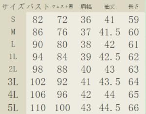 S バスト82 ウェスト囲72 肩幅36 袖丈41 長さ59 Mバスト86 ウェスト囲76 肩幅37 袖丈41.5 長さ60 L バスト90 ウェスト囲80 肩幅38 袖丈42 長さ61 1Lバスト94 ウェスト囲84 肩幅39 袖丈42.5 長さ62 2Lバスト98 ウェスト囲88 肩幅40 袖丈43 長さ63 3Lバスト102ウェスト囲92 肩幅41 袖丈43.5 長さ64 4Lバスト106ウェスト囲96 肩幅42 袖丈44 長さ65 5Lバスト110ウェスト囲100 肩幅43 袖丈44.5 長さ66