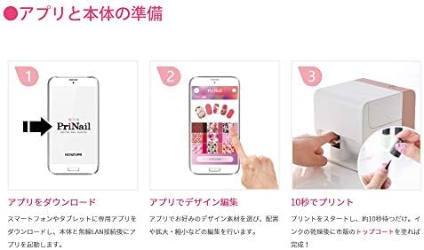 ・電源:AC100-240V 50/60Hz ・消費電力:7.2W ・爪検出方法:本体内にカメラ搭載 ・対応デバイス:モバイル端末(iPhone/iPad/Android) ・サイズ:約135(W)×150(D)×136(H)mm ・重さ:約1200g ・接続方法:Wi-Fi 無線LAN IEEE802.11b/g/n ・プリント品質:4800×1200dpi(※写真品質) ・付属品:スタートガイド(保証書付)、インクカートリッジ、プリコート、フィンガーホルダー、メンテナンス用ホルダー、メンテナンス用シール6枚、電源コード