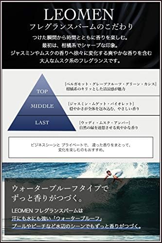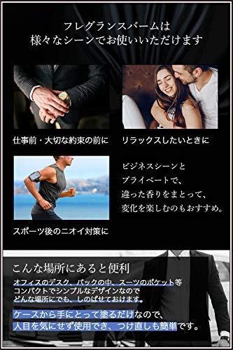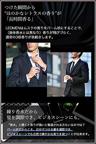 ⭐【高い持続力】LEOMEN フレグランスバームはウォータープルーフタイプの練り香水です。液体香水と異なりバームは香りが飛びずらいのが特徴で、通常のパフュームよりも持続時間も3倍長続きします。また、汗や水で香りが落ちにくい素材をしようしているので、夏場や汗をよくかく現場でも香りが落ちにくいです。