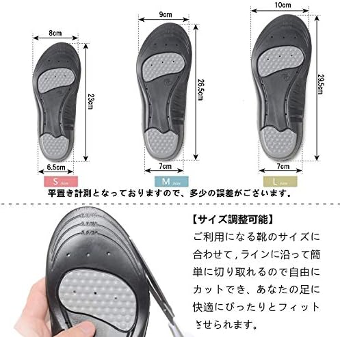 【サイズ調整可能】S:(約19~23cm) M:(約23.5~26.5cm) L:(約27~29.5cm)※つま先部で約0.5cm、かかと中心部で約1cmの厚みがあります。 切りやすいように裏面にラインが付き、ハサミで簡単にカットでき、お持ちの靴に合わせてサイズの微調整が可能です。※ジャストサイズの靴、紐で調節のできない靴でのご使用は、窮屈になる場合がありますのでご注意ください。大きめに切り、一度靴の上に敷いて微調整をお勧めします。※商品本体裏側に表記されているR・Lは、右用R、左用L の表記になります(サイズ表記ではありません。水で洗え可能、汚れが気になったら洗剤を付けたブラシで丁寧に水洗いし、陰干しにしてください。
