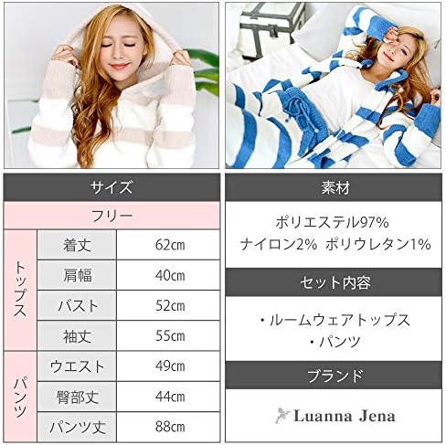 【商品仕様】〇サイズ:フリーサイズ 〇サイズ目安:着丈62cm 袖長さ60cm 肩幅40cm バスト52cm 袖丈55cm ウェスト49cm 臀部丈44cm パンツ丈88cm 〇素材:ポリエステル97% ナイロン2% ポリウレタン1% 〇セット内容:ルームウェアトップス+パンツ 〇ブランド:Luanna Jena