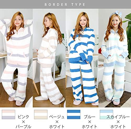 【ルームウェア上下セット】フォトジェニックなパーカータイプのトップスと同じ柄のパンツの上下セット。キュートなボーダー柄で、寒い季節のリラックスタイムを楽しく過ごせちゃいます。お部屋でくつろぎたい時、就寝時にどうぞ。
