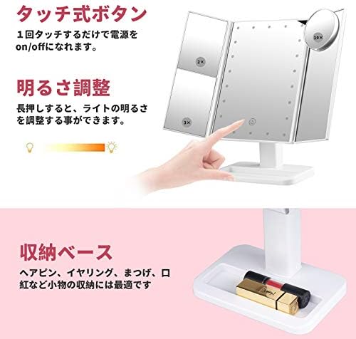 Touch type & adjustable brightness: The center of the mirror has a touch panel that can be turned on and off with just one touch. Long press to adjust the brightness of the light. The adjustable brightness allows you to have the perfect light. The makeup mirror also comes with a storage base perfect for storing hair clips, lipsticks, and more!