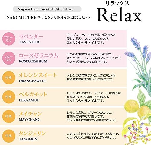 NAGOMI AROMAシリーズ商品は全て、合成香料などを添加していない100%ピュアなエッセンシャルオイルです。信頼のおける海外の蒸留所やホールセラーから直接精油を買い付けています。NAGOMI AROMAシリーズ商品のエッセンシャルオイルが安い理由は、徹底的なコストカットと簡単な流通経路にあります。●徹底的なコストカット品質を確認した精油のみを購入しており、高価な国内での検査や過剰な包装など、製品の品質向上に役立たない経費は使用しておりません。●簡単な流通経路百貨店などで販売されているエッセンシャルオイルは複雑な流通経路により、生産者からお客様に届くまでに費用がとてもかかってしまいます。なごみでは百貨店に流通しているものと変わらない品質の原材料を扱い、ほとんどの商品を現地生産者から直接購入して社内で小分け加工(瓶詰)を行っており、皆様に卸売り価格でご提供しています。●時期によって、産地が変更になる場合がございます。予めご了承ください。セット内容・真正ラベンダー、ローズ・ゼラニウム、オレンジ・スイート、ベルガモット・カラブリアン、メイチャン(リツェアクベバ)、タンジェリン 各5ml 6本セット■真正ラベンダー学名:Lavandula angustifolia抽出部位:花精油製造法:水蒸気蒸留法科名:シソ科産地:フランス、ブルガリア香りの特徴:ウッディーベースの上品で鮮やかな優しい香りです。■ローズゼラニウム学名:Pelargonium asperum抽出部位:葉精油製造法:水蒸気蒸留法科名:フウロソウ科産地:シンガポール、南アフリカ、レユニオン島、フランス香りの特徴:ほのかな甘さを感じるバラに似た香りの中に、ハーバルのフレッシュさを加えた透明感のある香りです。■オレンジ・スイート学名:Citrus sinensis抽出部位:果皮精油製造法:冷却圧搾法科名:ミカン科産地:イタリア、オーストラリア 、ブラジル、USA香りの特徴:オレンジの皮をむいたときに広がる甘くさわやかな香りそのものです。■ベルガモット・カラブリアン学名:Citrus bergamia抽出部位:果皮精油製造法:冷却圧搾法科名:ミカン科産地:イタリア香りの特徴:レモンよりも甘く、デリケートな柑橘系の香りです。■メイチャン(リツェアクベバ)学名:Litsea cubeba抽出部位:果実と葉精油製造法:水蒸気蒸留法科名:クスノキ科産地:中国香りの特徴:レモンに似た、グリーンがかった柑橘系の爽やかな香りです。 ■タンジェリン学名:citrus reticulata抽出部位:果皮精油製造法:冷却圧搾法科名:ミカン科産地:ブラジル香りの特徴:ミカンに似た甘くすがすがしい香り。オレンジ・スイートに似たその香りは、ほのかでデリケートな印象です。