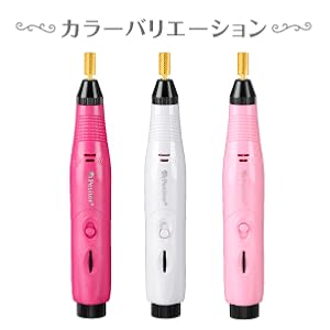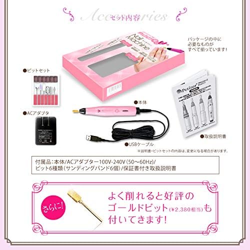 Rotation Speed: 7500-14500 RPM (measured tested) Color: Baby Pink, Cherry Pink, Natural White, Rose Mud, Body Weight: 1.8 oz (45 g), Body Size: 5.1 x 0.9 inches (130 x 22 mm); Accessories: Main unit: AC adapter 100V-240 V (50 – 60 Hz); 6 bits (6 sanding bands) / Instruction manual with warranty card