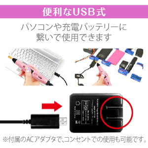 お手持ちのパソコンや充電バッテリーに繋いでいただけるので、ご使用場所を選びません。