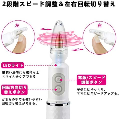 2段階スピード+左右回転可:粗い研削から細かい研削まで、必要に応じてスピードが二段階調整できます。削るパワーも弱すぎず、強すぎずと、子供にはゆっくり、ママにはスピードアップも。しかもどちらの手でも使いやすい回転切り替えができてかなり便利です。動作音が大きくない、高速回転することで短時間で爪を整えられます。また、自動off機能を搭載しております。2分間連続して使うと、自動でパワーオフになります。手元ライト付き、ほんのり照らすライト付きなので、寝ている時にもやさしくケアができます。