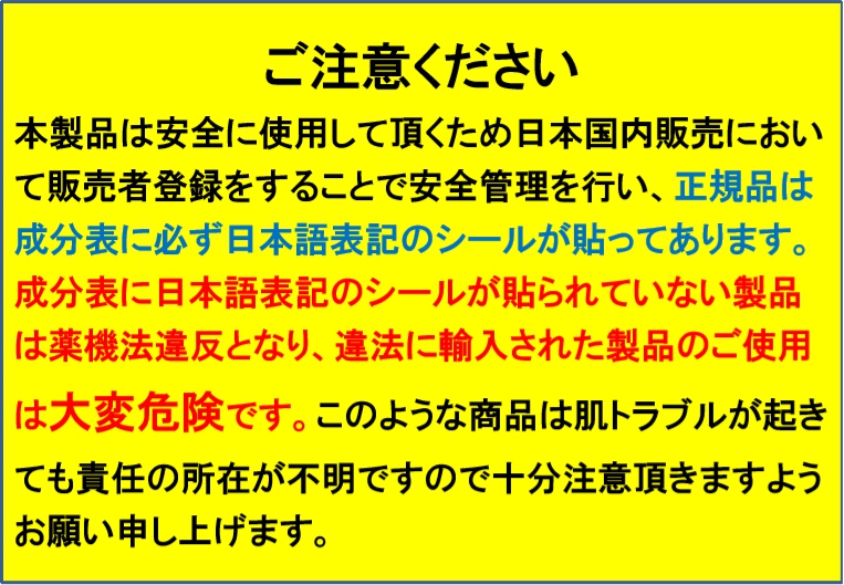 成分表が日本語表記でない商品は違法に輸入された商品で大変危険です。肌トラブルが起こっても責任の所在が不明ですので、使用の前に必ず確認してください。