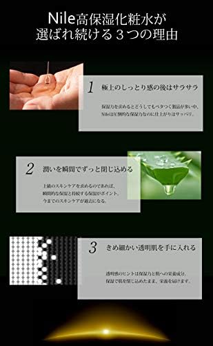 【美しい肌の秘訣は持続する保湿力】朝スキンケアをしても夕方には 保湿力 が落ちてしまい、乾燥肌 テカリ肌 になることがありますが、Nile 高保湿 化粧水は 最大16時間の保湿力で肌へのバリア機能を持続します。