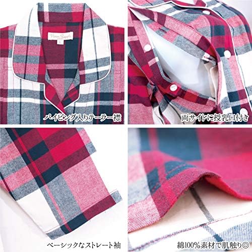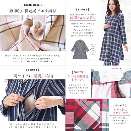 【仕様】産院で指定されることの多い、前開き&ロング丈。着替えもしやすく、診察にも最適な前開きタイプ。パンツなしでもゆったり着られるロング丈仕様で安心して着用いただけます。両サイドにボタン開閉式の大きく開く授乳口付き。ウエスト調整機能付きパンツはお腹のふくらみ具合に合わせてウエストサイズが調整できる便利なアジャスター付き。 トップス右サイドにスマホや小物を入れられる便利なポケット付き。