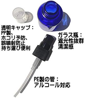 特徴:本体はガラス、キャップとノズルはPP製、管はPE製なのでアルコールにも耐性がしっかりしていて安心