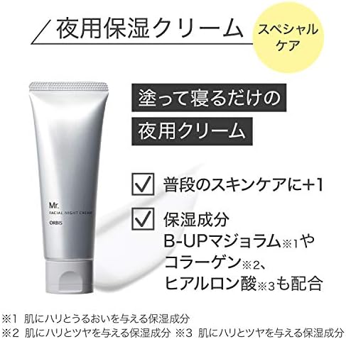 男性向けの夜用保湿クリーム、ミスター フェイシャル ナイトクリームと男性用スキンケア「Mr.シリーズ」の洗顔料とオールインワン化粧水のミニサイズセットです。