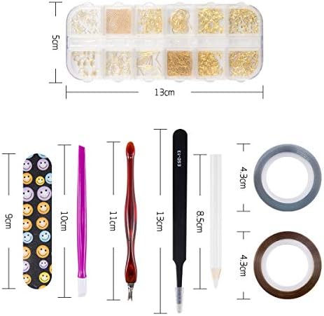 【内容物】:ネイルストーン*6、ピンセット*1、ポイントドリルペン*1、ゴールドラインテープ*1、シルバーラインテープ*1、キューティクルカッター*1、ゴム棒*1、ネイルファイル*1(ご注意:ネイルファイルのカラーはランダムに発送させていただきます。)