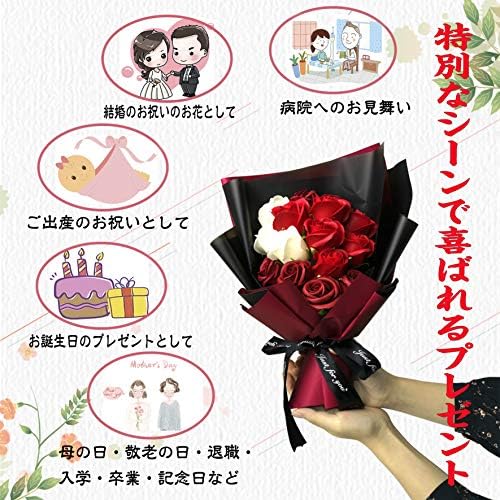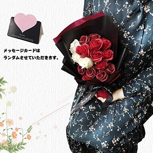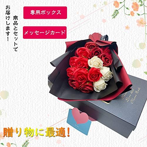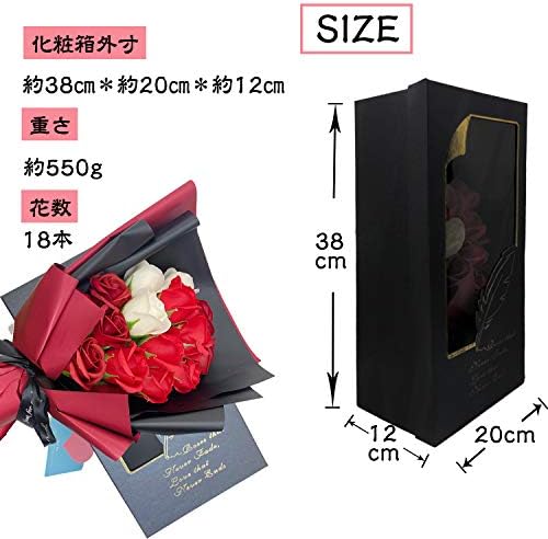 (Specifications/Package Contents) Gift Box Size: Length 14.6 x Width 7.9 x Height 4.7 inches (37 x 20 x 12 cm); Material: Soap; Flower Color: Red + White; Number of Flowers: 18; Package Content: 1: Bouquet + Window Gift Box x 1, Message Card x 1.
