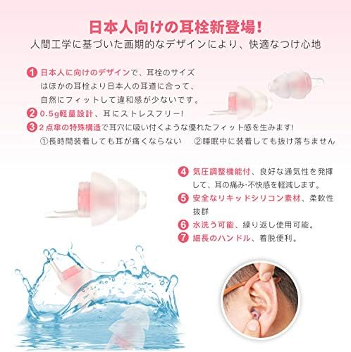★【日本人向けの耳栓 快適なつけ心地】人間工学に基づいた画期的なデザイン、日本人の外耳道にあわせて設計、2点傘の特殊構造で耳穴に吸い付くようなフィット感があり、睡眠中に装着しても抜け落ちません。環境保護、無毒性の素材を採用し、柔軟性抜群で、長時間装着しても耳が痛くなりません。日本人向けのデザインで、耳栓のサイズはほかの耳栓より日本人の耳道に合って、自然にフィットして違和感が少ないです。気圧調整機能付、良好な通気性を発揮して、耳が詰まるような不快感がありません。取って部分を短く設計しているので、寝返りの際に邪魔になりにくいです。