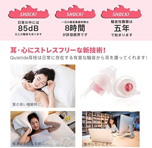 例えば、交通量の多い交差点の騒音は85~90dB。優れた遮音性能を持つQuietide耳栓を使用するとこれが約55dBまでダウン。静かなオフィスにいる時と同じ環境になります。Quietide耳栓は、工場・航空関連・射撃・ライブ・スポーツイベント等の騒音環境から耳を守る商品です。勉強・読書・睡眠・ライブ・環境騒音対策・電車内などで騒音レベルを下げたい・静かな環境を得たい方にもご使用いただいております。「おしゃれで実用的なアイテム」です!!