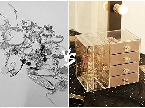 【防塵・良く保管】ホコリや傷から貴重なジュエリーをよく保管します。 右は4つの引き出しがあり、小分けの仕切りがたくさんあるので、内にはベルベット生地で装飾して、柔らかくネックレス、イヤリング、ピアス、指輪、ブレスレットや腕時計貴重な物はよく保護します。