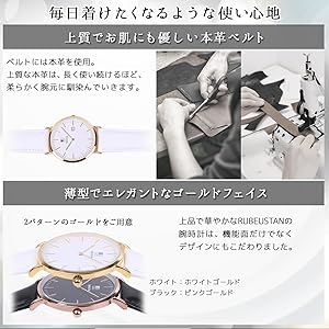 デザイン:シンプルなデザインのケースに本革ベルトを使用していますので、様々なシーンで着用することができます。カラーバリエーションは2種類で、ホワイト/ブラックをご用意。また、便利なカレンダー搭載モデルもご用意しておりますので、お好みのモデルをお選びください。
