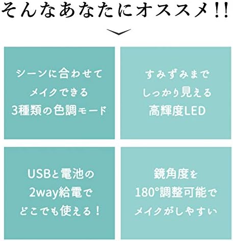 シーンに合わせてLED色を変更でき、その場にピッタリのメイクアップが可能です。