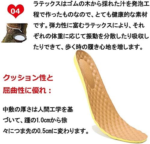 ●ラテックスはゴムの木から採れた汁を発泡工程で作ったものなので、とても健康的な素材です。 中敷の厚さは人間工学を基づいて、踵の1.5cmから徐々につま先の0.5cmに変わります。