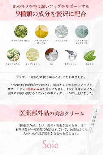 Soie has not only a whitening effect, but also a luxurious blend of 9 ingredients that support skin texture and moisture enhancement. This product is made with a carefully selected body cream that can be used in areas of concern over your entire body.
