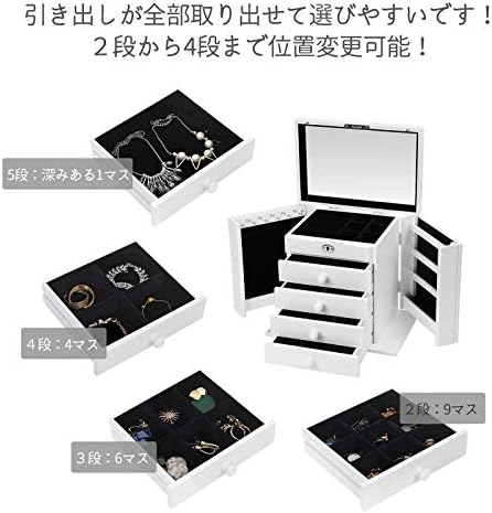 【大容量収納】五段式で、多種類の仕切りがあり、ご愛用のリング、ピアス、イヤリング、ネックレス、ブレスレット、時計等はアイテムごとに収納できるジュエリーボックスです。サイドにはネックレスを掛けるフックとイヤリングを掛けるポールがデザインされ、限られた空間にディスプレイ感覚で大容量に収納