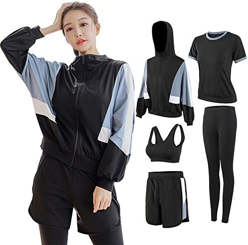 5 Set Includes: Sports bra, T-shirt, Sports hoodie, Shorts and tights.